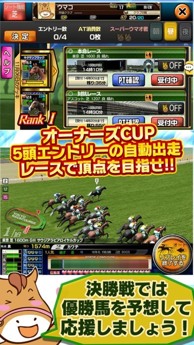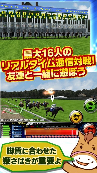 競馬ファンも納得の美しいグラフィック!シンプルなムチ操作と5つの脚質による奥深いレースアクション! すべてが興奮のモバイル最強クオリティの競馬ゲームです!
