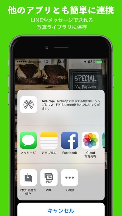 ・選択画像が複数のときは、facebook・カメラロールの他に、PDFを作成してPDFを他のアプリに渡すことができます。
