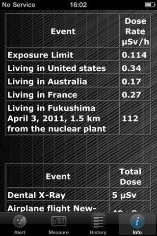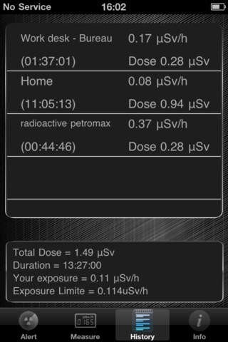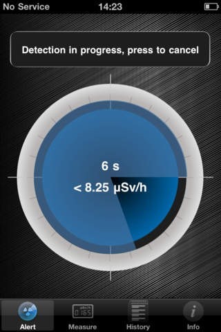 最初のタブで利用できる"アラート"機能は、(時計、放射性金属片30代の中で6.6μSv/ h以上近くの汚染と放射線源の存在を検出することができます...).