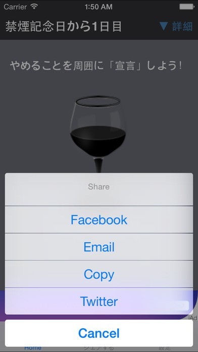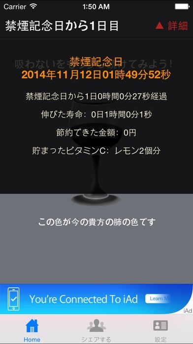 禁煙したいけれどもなかなか達成できない喫煙者は多いのではないでしょうか。そんな時にぴったりのアプリが「禁煙記念日」です。スタートボタンを押すと、黒いグラスが登場し現在の肺の状態というメッセージが出ます。日時が経過すると、禁煙から何日続いているか秒単位で表示される上、伸びたであろう寿命日数まで出るので、体にいいことをしている気分になります。節約できた金額もでるので、やる気も上がるでしょう。ツイッターで共有することもできるので、周りにアピールして褒めてもらうのもいいでしょう。