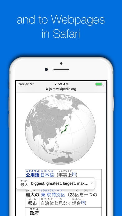 ホームページやメール、電子書籍などからコピーして入力したテキストに対して、すべての語にふりがなやローマ字表記をつけられる読書支援機能も特徴です。特定の語をタップするだけで即座に英語で意味も表示されます。