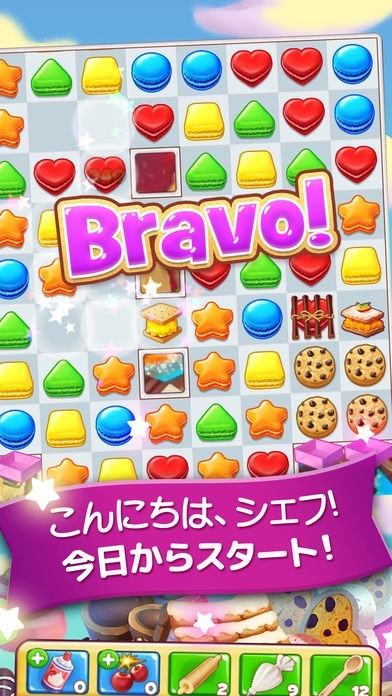 可愛いお菓子の世界を旅しよう!材料を繋げてクッキーを作る3マッチパズルゲーム!