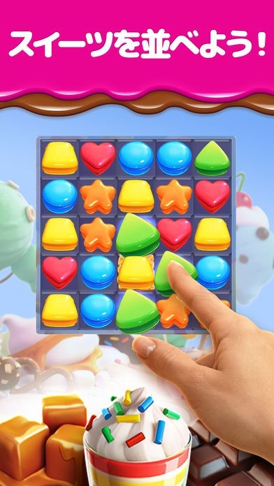カラフルで様々なお菓子の背景の中で楽しくパズルで遊べる