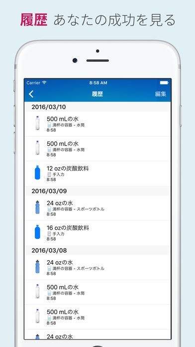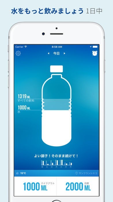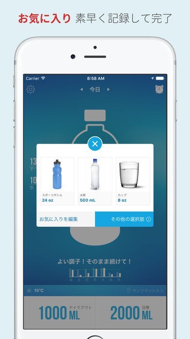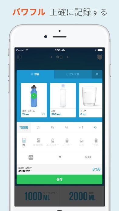 毎日の水分摂取量を記録して健康改善!登録は飲んだ量のボトルを選ぶだけの簡単操作!マイボトルも登録可能