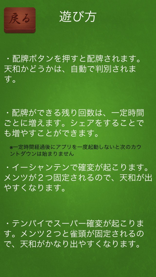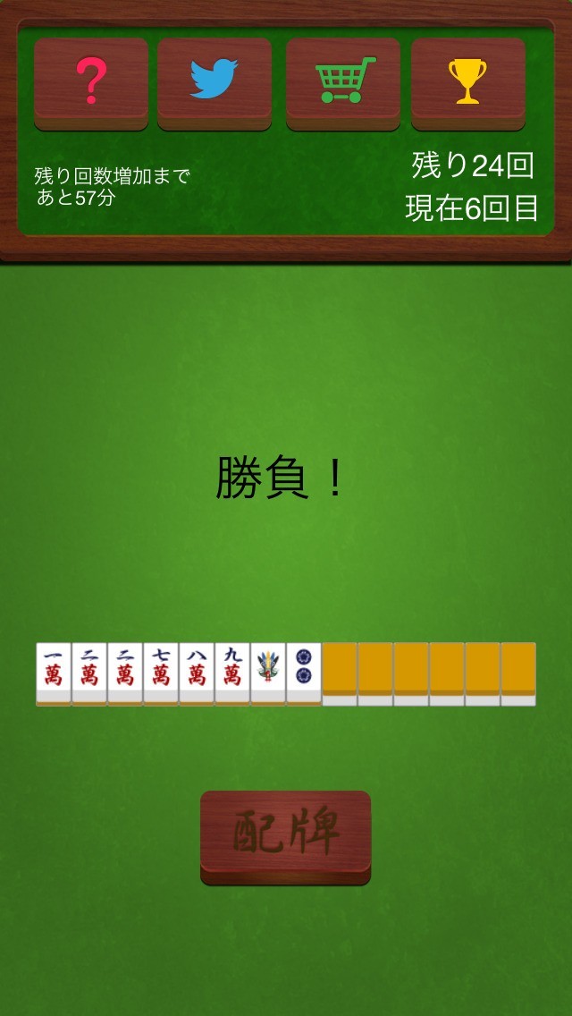 「エンドレス天和」は、配牌で天和で上がる経験を一度はしてみたいという方にピッタリの麻雀アプリです。試行回数を稼ぐことで確率の壁を越えて誰が初めに天和を完成させることができるかを競って楽しめます。例えば、初めに天和を完成した人にジュースをおごるなど、このアプリをきっかけの一つとした遊び方も魅力的です。このゲームで遊ぶ際にかかる時間は全くの未知数です。運が良ければ一回目の配牌で天和が完成することもありますし、運が悪い場合は33万回チャレンジしたとしてもそろわないこともあります。しかし、少しずつ牌がそろうことによってすでにそろっている牌を固定することができるので平均的なプレイ時間としては10分程度に収まります。