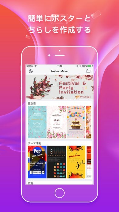 ポスター用の様々なテンプレートを使いスタイリッシュなポスターを作ることができます。ポスター以外にも誕生日カードやチラシなど様々ジャンルの広告をデザインできる利便性の高さもポイントです。