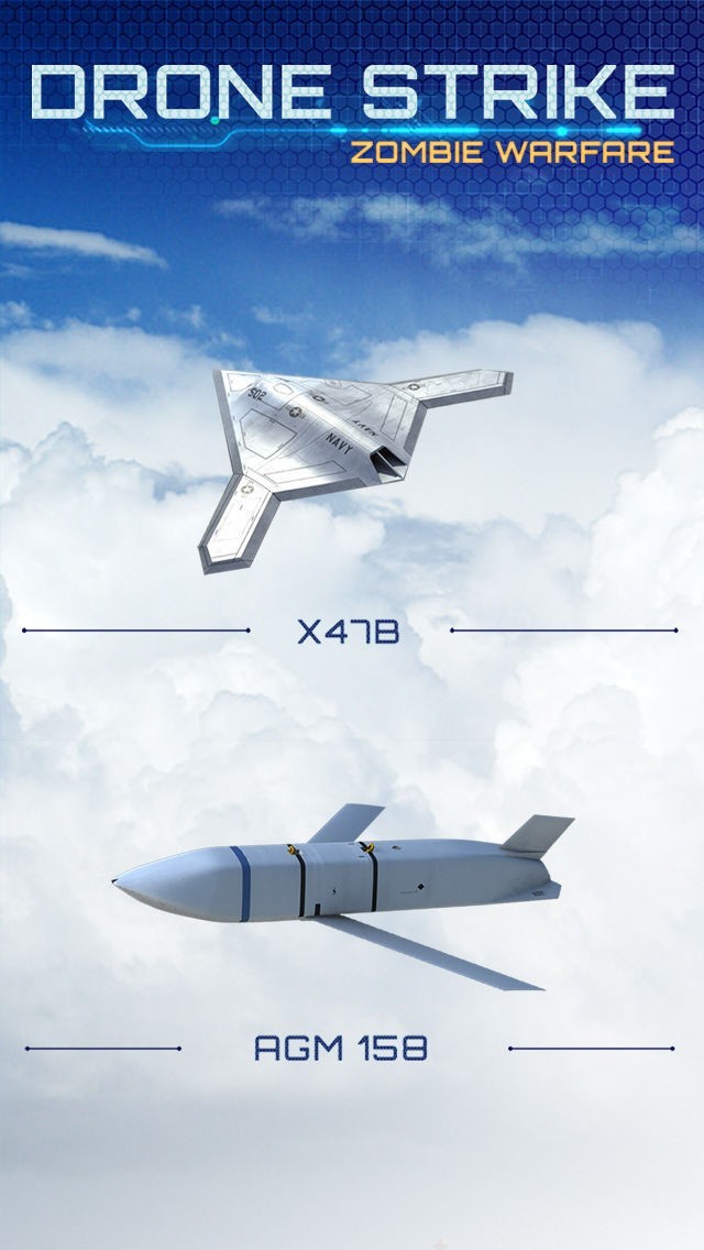 App Storeより引用Choose between the latest drones : Predator Drone (MQ-1), Global Hawk, Reaper Drone (MQ-9), X47B Drones, and the AGM-158 Cruise Missile.