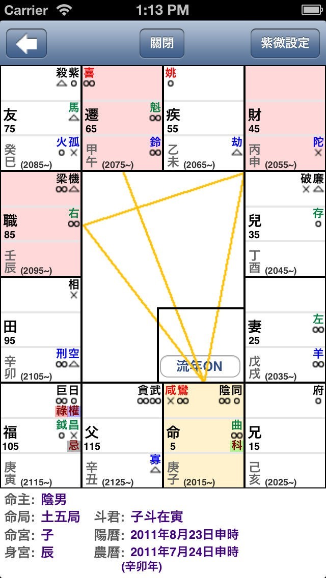 - 主星、佐星、煞星及桃花星用不同顏色字及位置顯示。