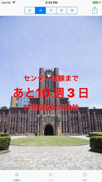 ユーザーが設定した年月日に合わせて、カウントダウンの表示ができます。 また決めることができるのは日付だけじゃなく、時間まで可能なので、様々な残り日数や時間を計ることができます。 主に大学受験者向けになので、設定できるカウントダウンは複数可能で、掛け持ち受験、出願日などの重要な予定を予めセットできるようになっています。