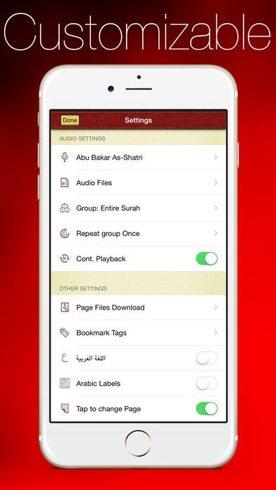 - English and Arabic languages with option to set only labels (Surah, Ayaah etc. ) and numbers in Arabic