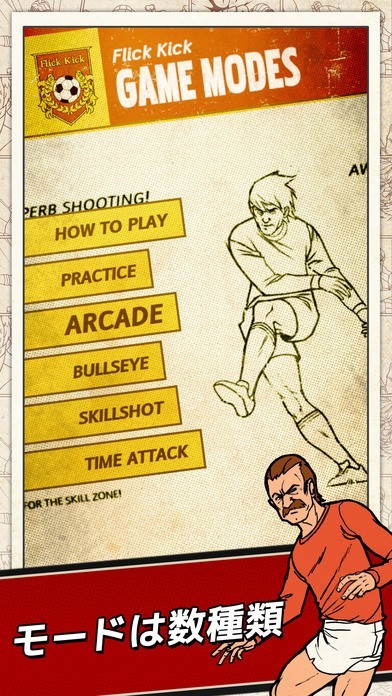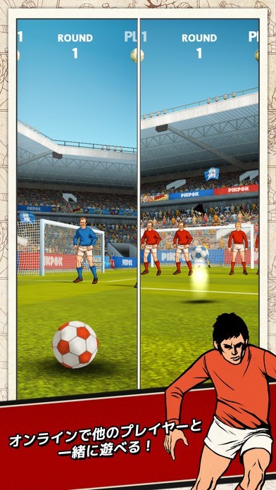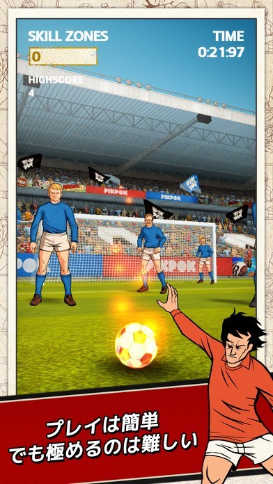 シンプルなフリック操作だけなのに奥深い病みつきになってしまうサッカーゲームアプリが「Flick Kick Football Free」です。ボールをフリック操作でキックすることでカーブやドライブなどさまざまな変化をつけることができるようになっているので、指先の操作を少しかえるだけで多彩なキックを繰り出すことができるようになっています。タイムアタックモードやブルズアイモード、アーケードモードなど多数のモードが収録されています。