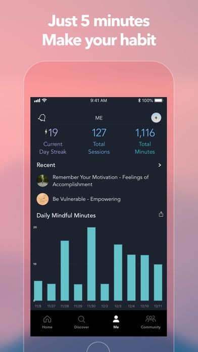 アプリ内のレッスンを活用すれば、毎日たったの5分で瞑想のトレーニングに取り組むことが出来ます。いつでも思いたったときに実施できるので、重荷に感じず習慣化できます。