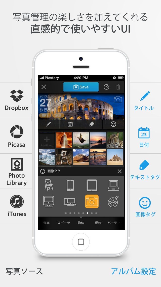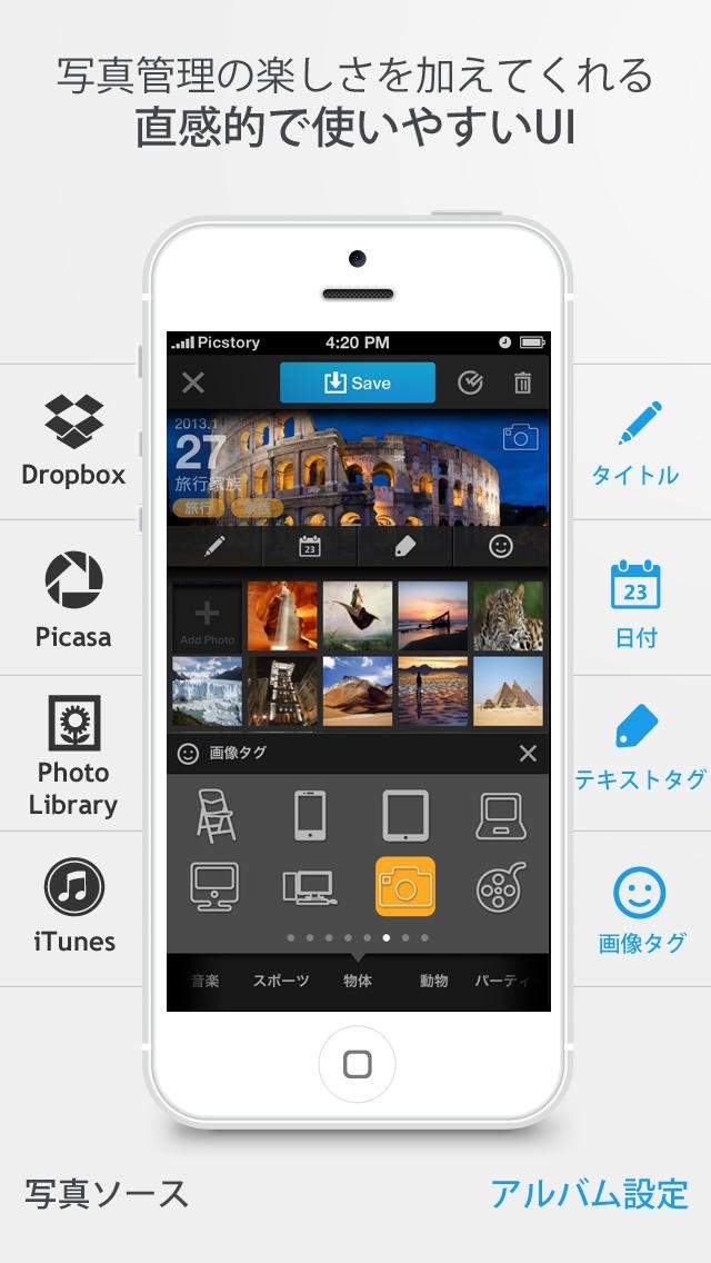PicStoryはiPad内蔵の写真アプリだけでなく、DropboxやPicasaのようなサービスとも