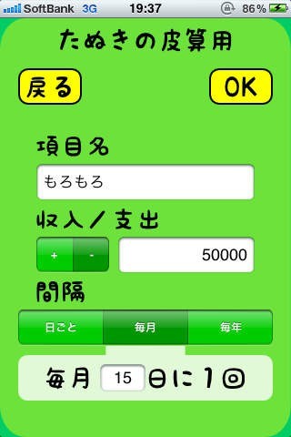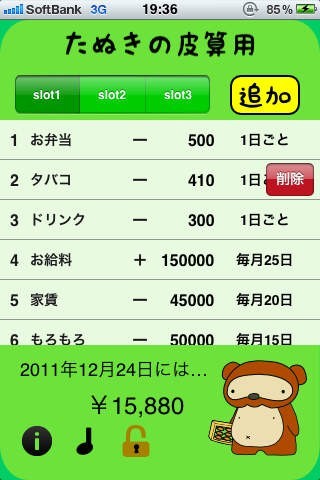 たぬきの皮算用は、アプリ名の元となった慣用句が意味する通り、収入と支出から未来の残金を計算するもしもの家計簿です。収入を登録し、想定される支出を入力していくと、何日にいくらのお金が残っているかがわかるようになり、家計のやりくりがしやすくなります。たぬきの皮算用らしく、そろばんを持ったたぬきのデザインがアプリにはあしらわれていて、楽しく家計を管理できます。細かく家計簿をつけるのは面倒くさい、大体の残金がわかればいい、という人に、たぬきの皮算用はおすすめのアプリです。