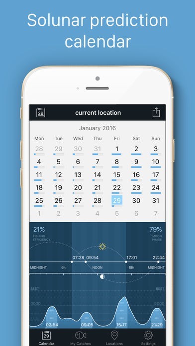 日の出や日の入り時刻、月齢などから釣れやすい地点や時間帯を予測してくれるカレンダーアプリです。釣れやすい日程や時間帯、場所を狙って大きな釣果を目指してみましょう。