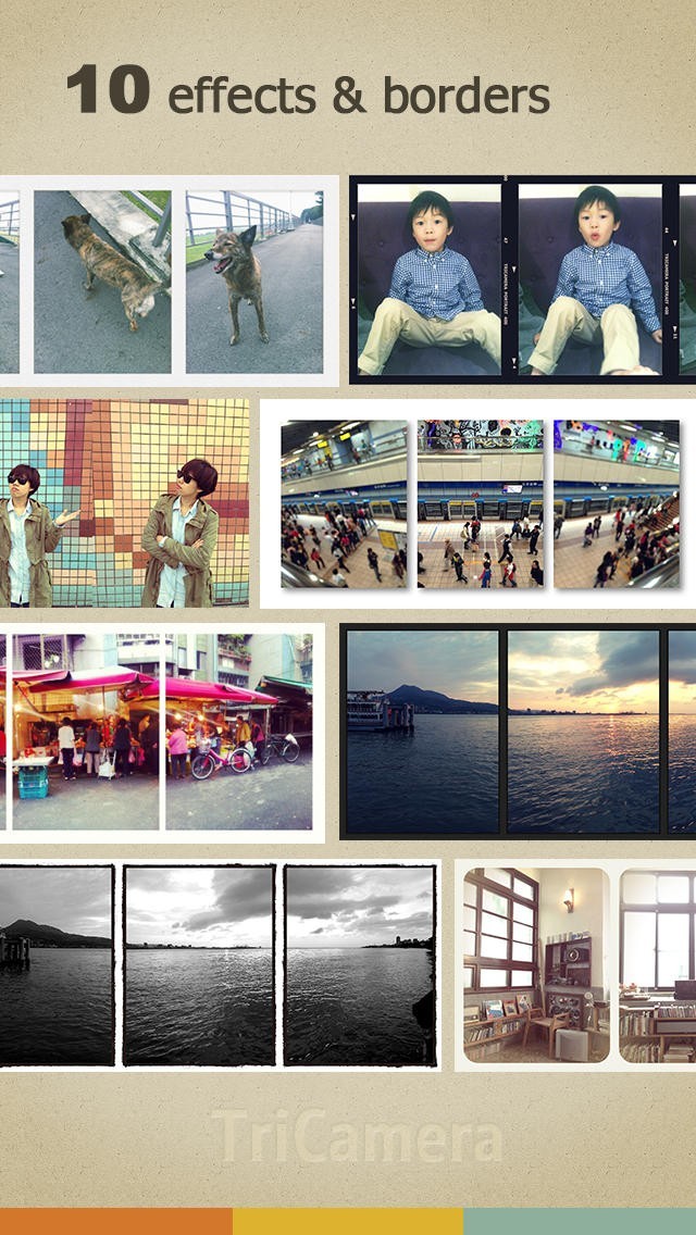 複数の写真をオシャレなテンプレートでまとめてくれる! パノラマ写真のように表現したり、まったく別の景色で合わせてみたりと、アイディアによって楽しみ方を広げることができます。 10種類のエフェクトを搭載し、雰囲気の調整なども自由自在! とっておきの写真に好みのエフェクトを加えてみましょう。 アプリからカメラを起動しての撮影ではオートフォーカス機能が利用可能となる一方、アルバムから写真を選んで組み合わせることもできるようになっています。