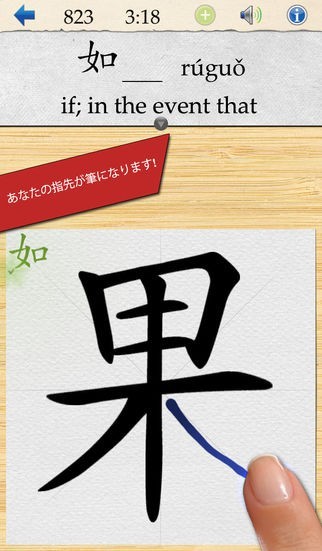 「勉強方法がガラリと変わりました。部屋から出て郊外の湿原や友達と近所を散歩しながらiPodのSkritterを使って勉強しています。常連の餃子屋さんに行くと、お店の子供達がこのアプリを使って漢字の書き方を教えてくれます。」