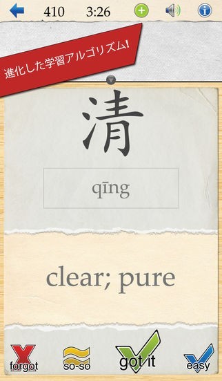 • 書き、発音、ピンイン、意味すべてを表示