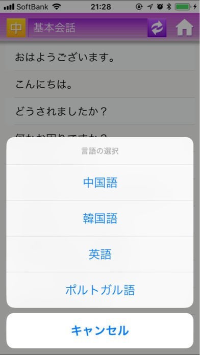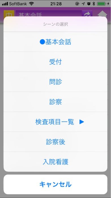 外国人患者との医療会話をスムーズにするこのアプリは4つの外国語に対応しています。基本会話や受付、診察といった7つの使用状況と、採血・採尿・CTといった7つの検査項目に分けられてフレーズが収録されています。