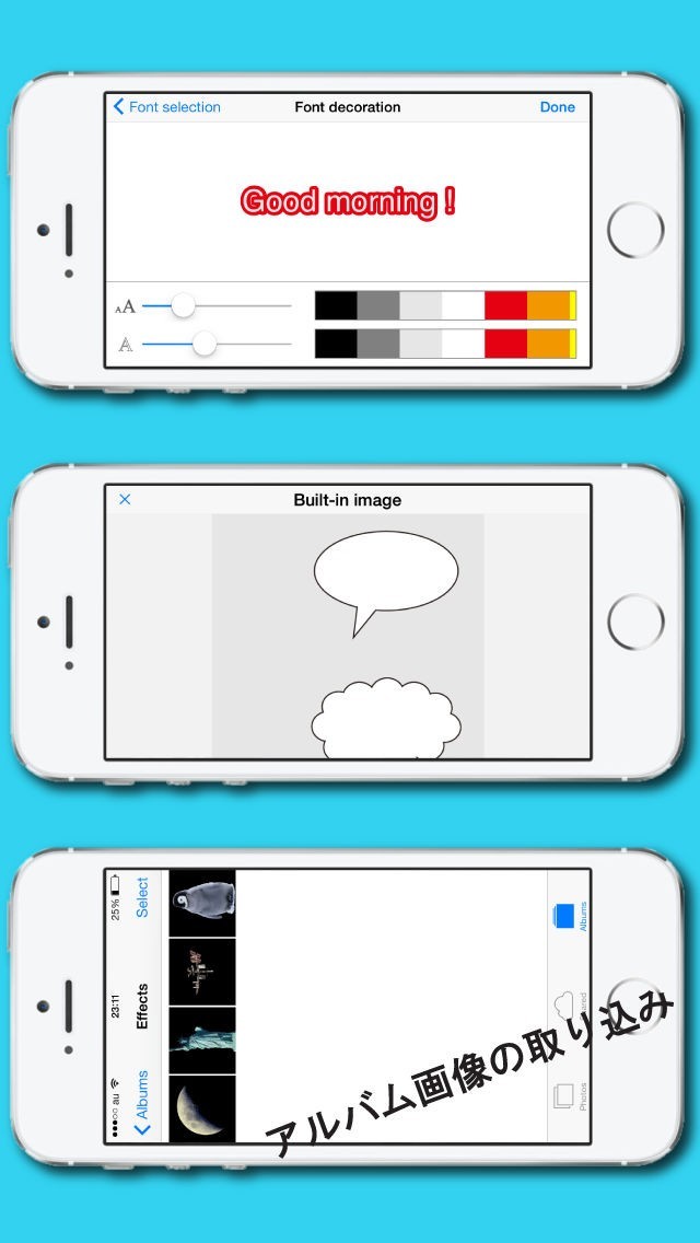 動画にお気に入りの写真や画像が貼り付けられるようになっています。また吹き出し等のスタンプを挿入する事が可能なので、コミカルなビデオを制作したい時に重宝しますよ。