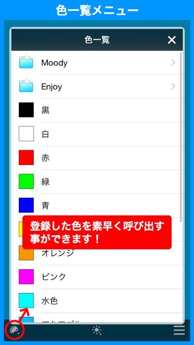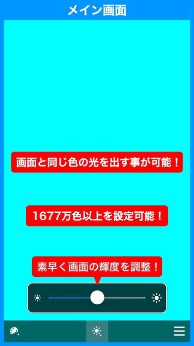 App Storeより引用カラフルな光の懐中電灯アプリです! 明かりは画面のバックライトを使用します。