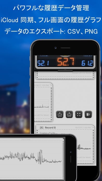 このアプリは、リアルタイムの騒音を計測できるノイズメーターです。計測データは、アプリに記録しておくことが可能で、データをメールに添付しシェアすることもできます。
