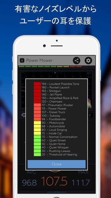 とても扱いやすく、計測の信頼性も高い、希少なノイズ/サウンド計測アプリで、 iOSデバイスを音量計測器へと変身させることができ騒音調査に役立てています。