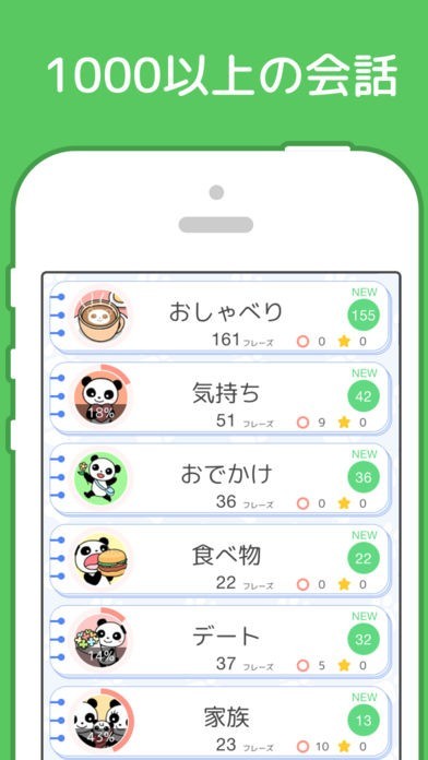 アプリにある全てのフレーズには日本語訳と解説がついているので、理解を深めながら学習することができます。カテゴリーごとに理解度をチェックすることができるので、苦手分野の克服ができます。