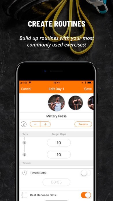 毎日のトレーニング目標を部位ごとにルーティンとして複数登録できるようになっています。また登録した目標は他のユーザーにシェアすることもできるので、モチベーション維持にも便利。