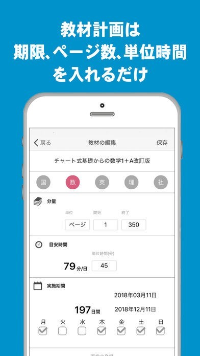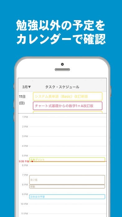 いつも使っている参考書のページ数や1ページあたりの時間を登録すると簡単に1日の勉強時間を計算し、自動でスケジュールを作成。進捗に応じて、1日の勉強時間を最適化。