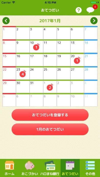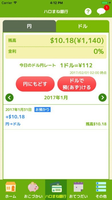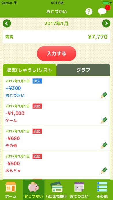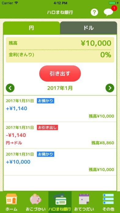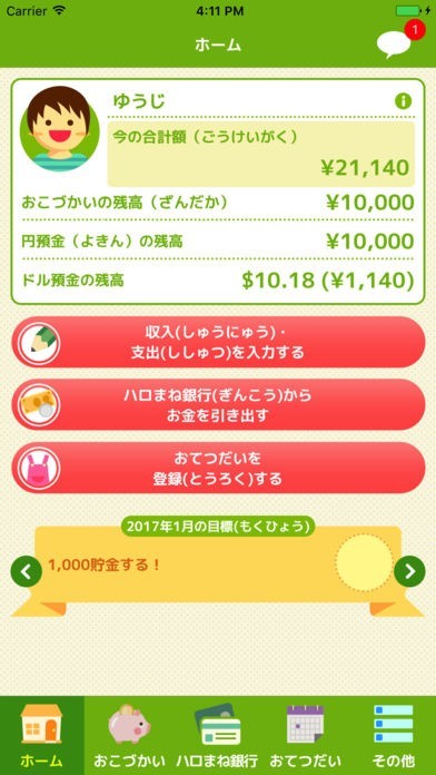 本アプリは、おこづかいの収入・支出管理機能のほかにも、銀行や利息、外貨交換の仕組みを学べるハロまね銀行機能や、お子様が取り組んだおてつだいを記録・管理できるおてつだい機能など、親子で一緒に遊んで学べる機能がそろっています!