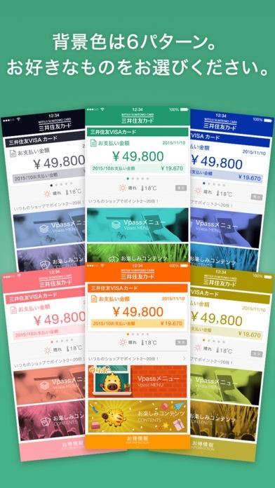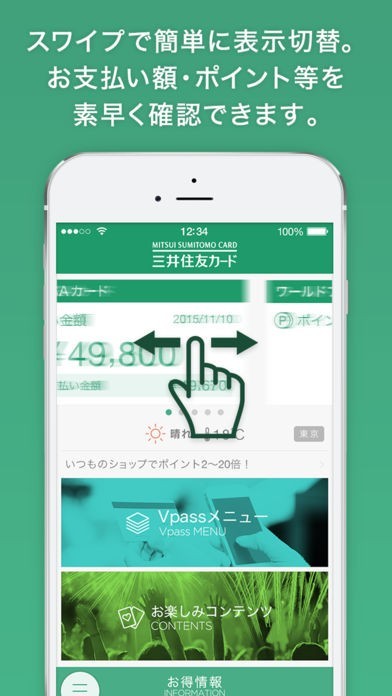 三井住友カード会員向けのサービスであるVpassの便利な機能をスマホで利用できます。トップ画面ではカードの支払金額など知りたい情報をスワイプ操作で切り替えて見られます。