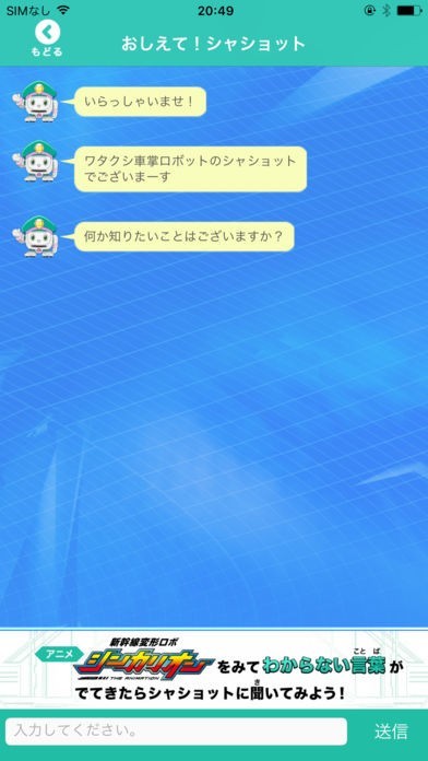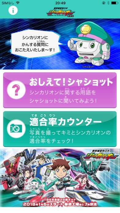 App Storeより引用テレビアニメ「新幹線変形ロボ シンカリオン」に登場する車掌ロボットの「シャショット」に質問したり、シンカリオンの運転士になるのに必要な「シンカリオン適合率」を計測できるアプリだぞ!!