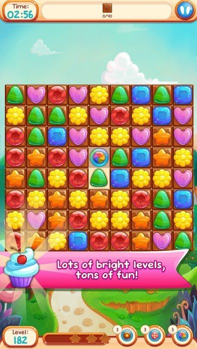 Discover the many bright and fun levels in this enjoyable game. Chocolates, cookies, cupcakes and colorful candies in abundance! Sweet? You bet ya!