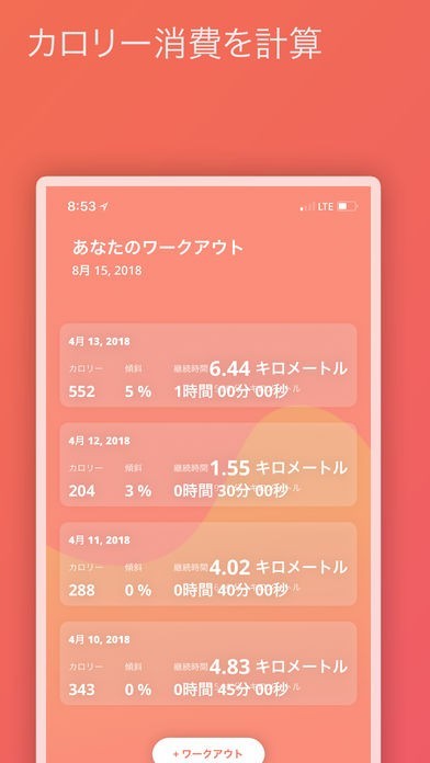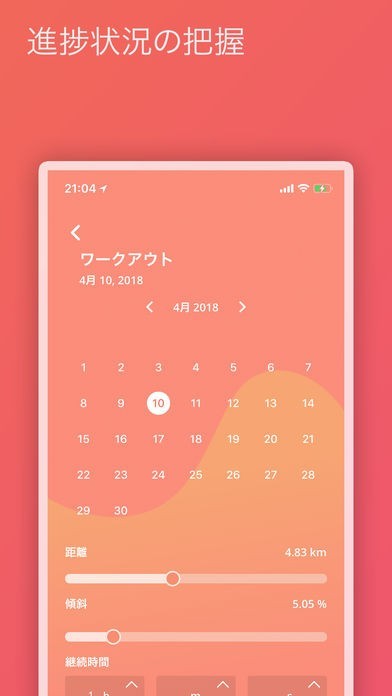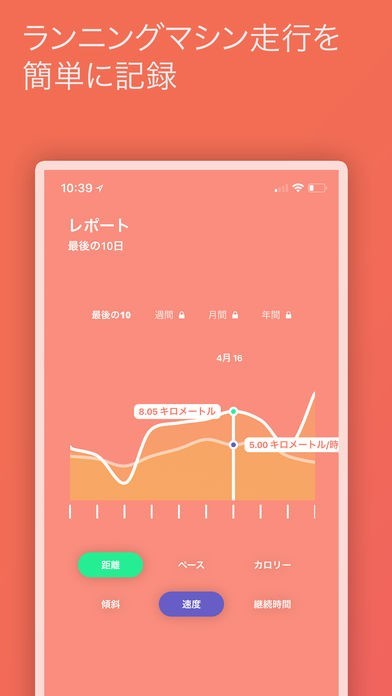 App Storeより引用ランニングマシントラッカーにより,ランニングマシンでのランニングを簡単に記録し,経過を追跡できます。