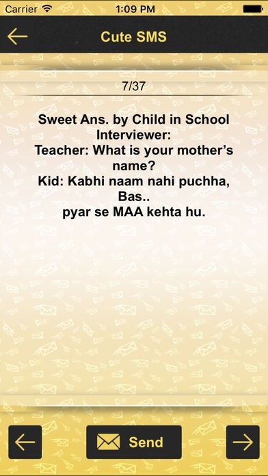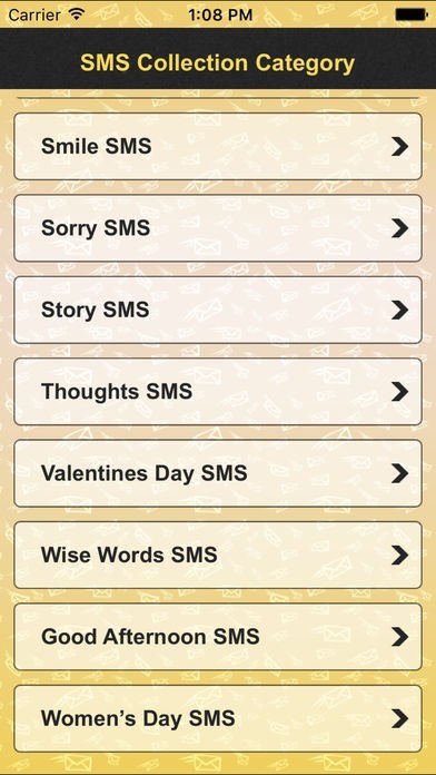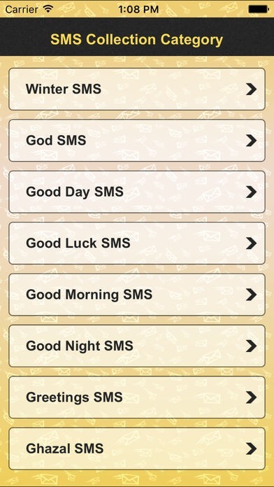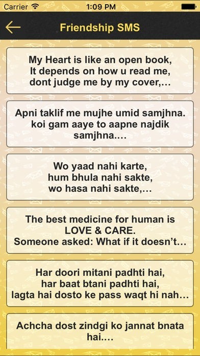 List of some of the most popular categories in this needed app : ASCII SMS Anniversary Quotes/SMS Birthday Wishes Break up / Broken heart Cool CID SMS Cricket bar forward Christmas messages / Christmas SMS Flirt & Kiss SMS Dirty fart Jokes for adults Friendship and love sayings Eid Mubarak SMS / Eid SMS Islamic SMS Inspiration sms Independence Day SMS Republic Day SMS Good Morning Messages Good Night SMS Messages Texts for Girl / Boy Friend Top Greetings & Wishes Halloween / Thanksgiving texts New Hindi SMS book Sad & Sweet combo Love poems Best love & romance quotes Quotes & wise sayings New Miss You poems Mother's Day Wishes Insult sms Joke sms Quotes SMS collection Romantic / Romance sms Funny & Humorous SMS Jokes Religious festival greetings Short comedy text messages Santa banta best jokes Smileys for Texting Coolest Sorry data texts Shayari & ghazals - Hindi Sher O Shayari /Shayri Sweet pickup lines Tender Love Words for texting Valentine's day Quotes Happy new year 2013 SMS Love quotes for love letters Love message / Love SMS New years eve resolution quotes Rajnikanth SMS Diwali Dhamaka SMS / Diwali SMS Riddle SMS Santa Banta SMS Sorry SMS Relpy Me SMS Story SMS Smile SMS Wise Words SMS