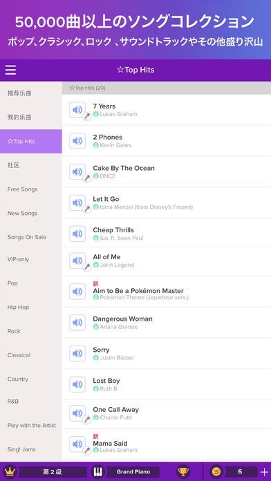 タップ操作でピアノ演奏が行えると同時に、人気曲が利用出来るのもメリットです