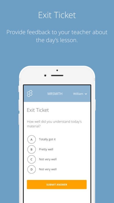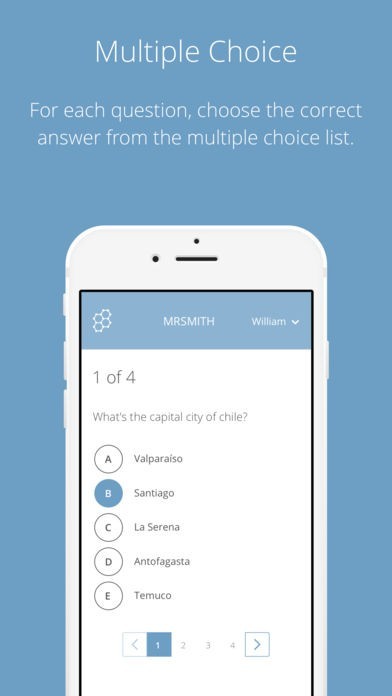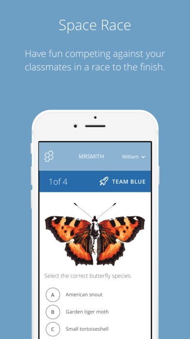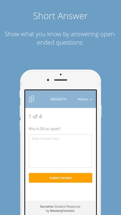 App Storeより引用Students share their understanding by answering formative assessment questions in a variety of formats: quizzes, quick question polls, exit tickets and space races. Once students launch the Socrative Student App, they'll be prompted to join the teacher's room via the teacher's unique code. No student accounts necessary!