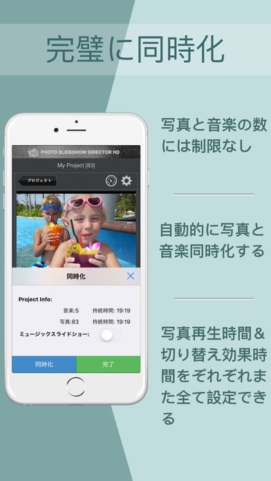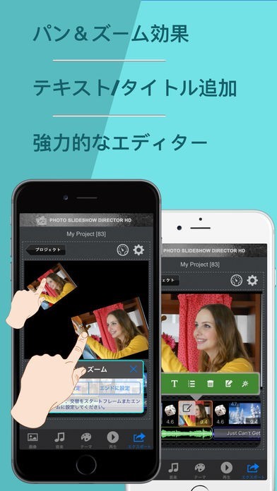 アプリでスライドショー作成するのはごく簡単です。タップだけで様々な画像と音楽をアプリに追加してから、搭載する切り替え効果とテーマを利用して、素人でもすぐ美しいスライドショー作れます。また画像にテキスト追加とか、切り替え効果調整とかなどもできます。