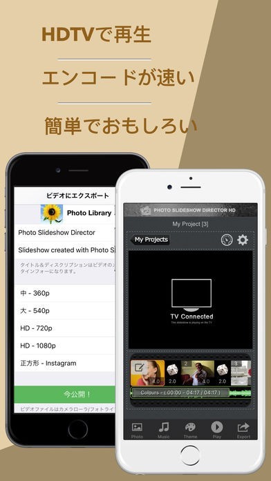フォトスライドショーをHD MP4ファイルにエンコードできます。スライドショービデオをカメラロールに保存して、次はPCに転送、TVで再生、などができます。