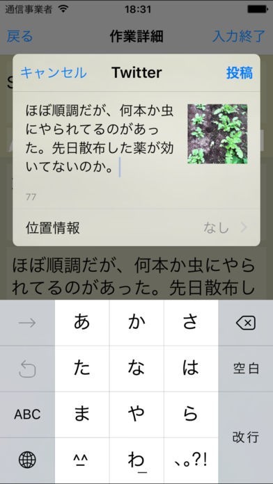 撮影した写真や作業の内容をTwitterやFacebookに投稿する機能があるから現在の畑の状態や作業が間違っていないかを同じように家庭菜園をしている人などに見てもらう事で情報の共有が簡単にできます。