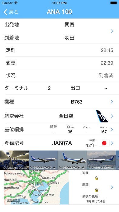 羽田空港のターミナル情報が確認出来ると同時に、飛行機の位置を調べる事が可能なので、到着時間を知りたい時に便利でした。座席表の閲覧に対応していて、地図がチェック出来る仕様も助かりました。