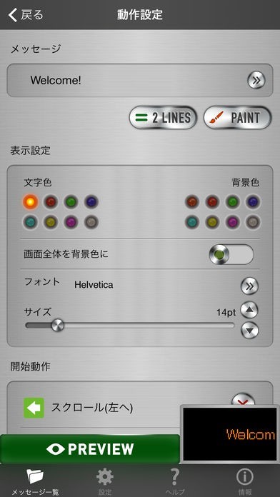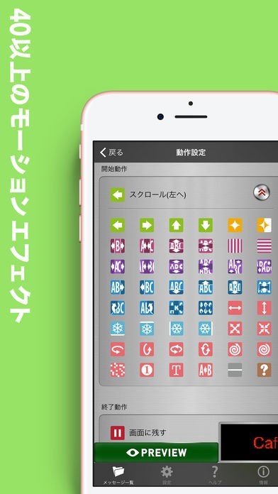 文字の色やサイズは自由に変更ができ、点滅する速度も決められます。文字に動きを加えたり、モーションを選べば、動画として保存ができるので、夜の街にあるような電光掲示板を作ることが可能です。