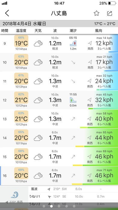 毎時の水温や天気や風波など詳細な海の天候がわかる