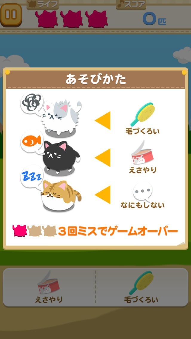 ねこせわは、猫たちが求めているお世話をしてあげるゲームです。とっさの操作が求められるゲームなので判断力を鍛えたり、集中して遊ぶことができるゲームです。猫たちが希望している毛づくろいやえさやり、なにもしないではないものを選択してしまうとライフが減少してしまいます。初めに3つ用意されているライフのうちすべてがなくなってしまうとゲームオーバーです。ゲームオーバーとなる前に何匹の猫のお世話ができるかスコアを競ってみましょう。