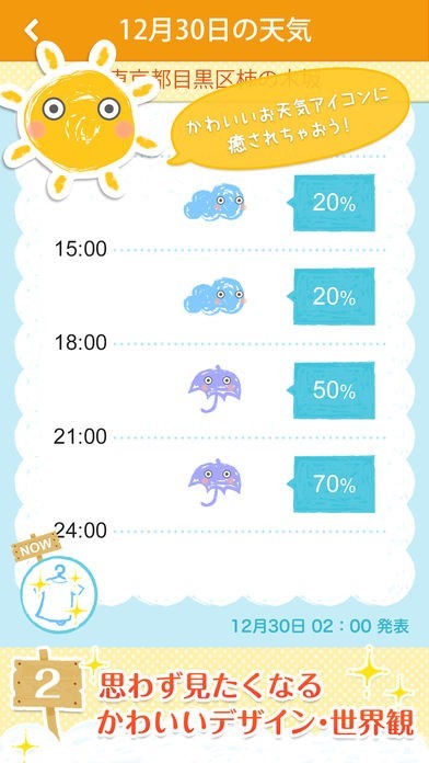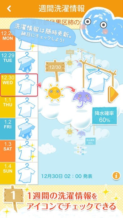 天気や時間の変化と共に、洗濯情報アイコンも随時更新されるので、こまめなチェックがおすすめです。
