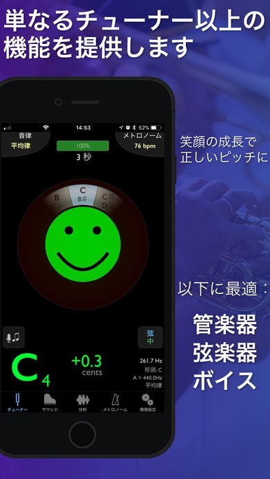 幅広い音域をカバーしていいるため、イメージした音を実際に再生したい時にこのアプリは役立ちます。複数音の再生や、純正律と平均律の切り替えが可能なため、例えば、「フレンチホルン・純正律・Fメジャー」のような音も聞くことができます。