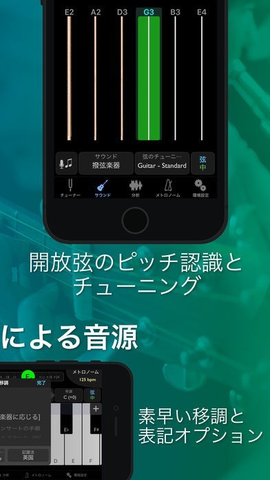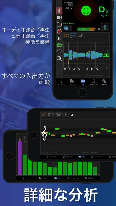 スマートフォンのライブラリーに保存している音楽をアプリにインポートしてチューニングして再生することが可能となっていて、好きな音楽で楽器などの練習をすることができます。