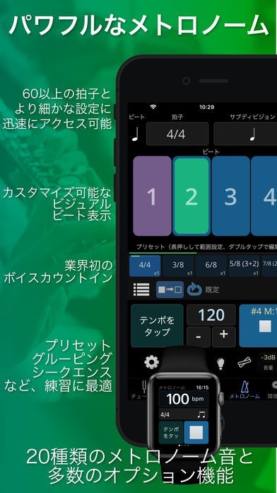 聴力トレーニングモードや音形表示といった音楽練習をサポートする機能を数多く搭載したこのアプリは、メトロノームとしても高機能です。テンポやサウンドの設定をプリセットで複数管理できるため、楽曲の変更のたびに設定をしなおす必要はありません。