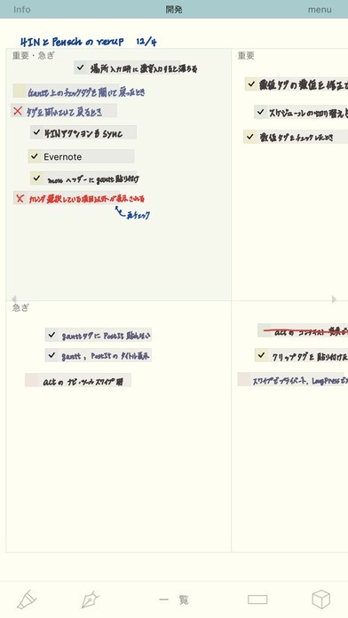 iPad/iPhone用の手帳アプリはたくさんあり、どれも素晴らしいアプリだと思います。ただし残念ながらどのアプリも紙とペンの使い勝手には敵わないような気がします。そこで4INでは、あらためて紙の手帳を最大のライバルと考え、それを超える使いやすさの実現を目標にしました。